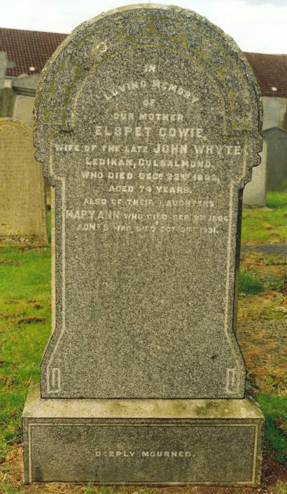 Date of photograph: September 2002 This gravestone is located at Insch Kirkyard, Insch, Aberdeenshire. The inscription reads: "In loving memory of Elspet Cowie wife of the late John Whyte Ledikan, Culsalmond who died Dec 22nd 1892 aged 74 years also of their daughters Mary Ann who died Sept 9th 1906"