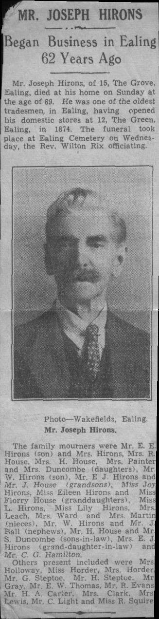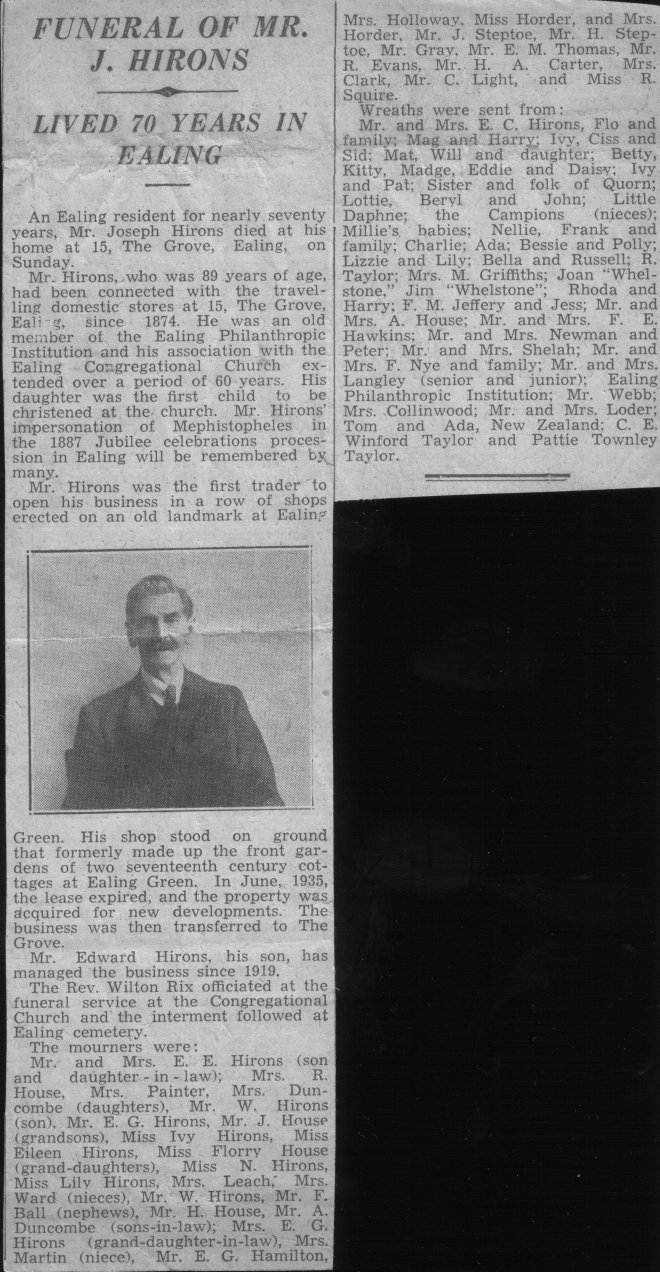 Funeral of Mr J Hirons Lived 70 years in Ealing An Ealing resident for nearly 70 years, Mr Jospeh Hirons died at his home at 15, The Grove, Ealing on Sunday. Mr Hirons who was 89 years of age, had been connected with the travelling domestic stores at 15, The Grove, Ealing, since 1874. He was an old member of the Ealing Philanthropic Institution and his association with the Ealing Congregational Church extended over a period of 60 years. His daughter was the first child to be christened at the church. Mr Hirons' impersonation of Mephistopheles in the 1887 Jubilee celebrations procession in Ealing will be remembered by many. Mr Hirons was the first trader to open his business in a row of shops erected on an old landmark at Ealing Green. His shop stood on ground that formerly made up the front gardens of two 17th Century cottages at Ealing Green. In June 1935, the lease expired and the property was acquired for new developments. The business was then transferred to The Grove. Mr Edward Hirons, his son, has managed the business since 1919. The Rev Wilton Rix officiated at the funeral service at the congregational church and the interment at Ealing Cemetary. The mourners were: