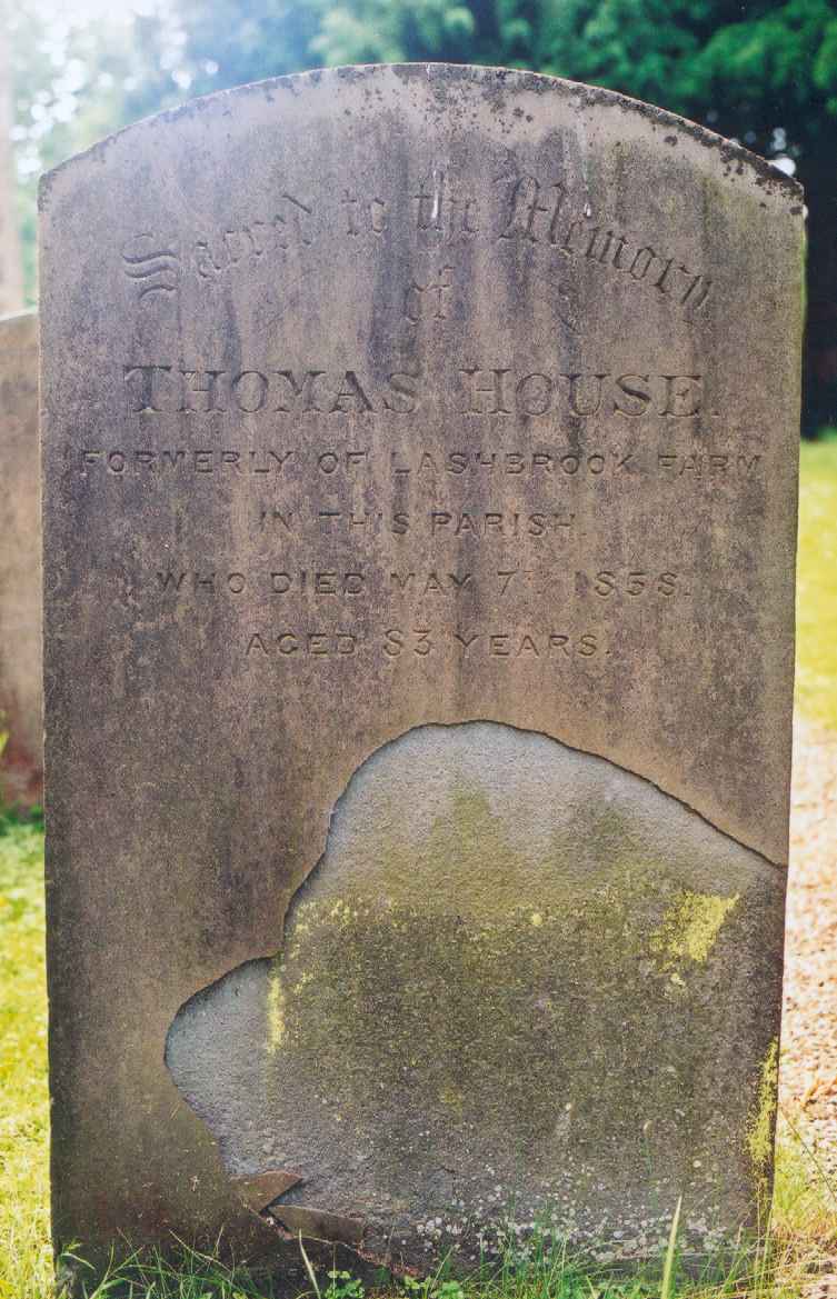 Sacred to the memory of THOMAS HOUSE formerly of Lashbrook Farm in this parish who died May 7th 1858 aged 83 years